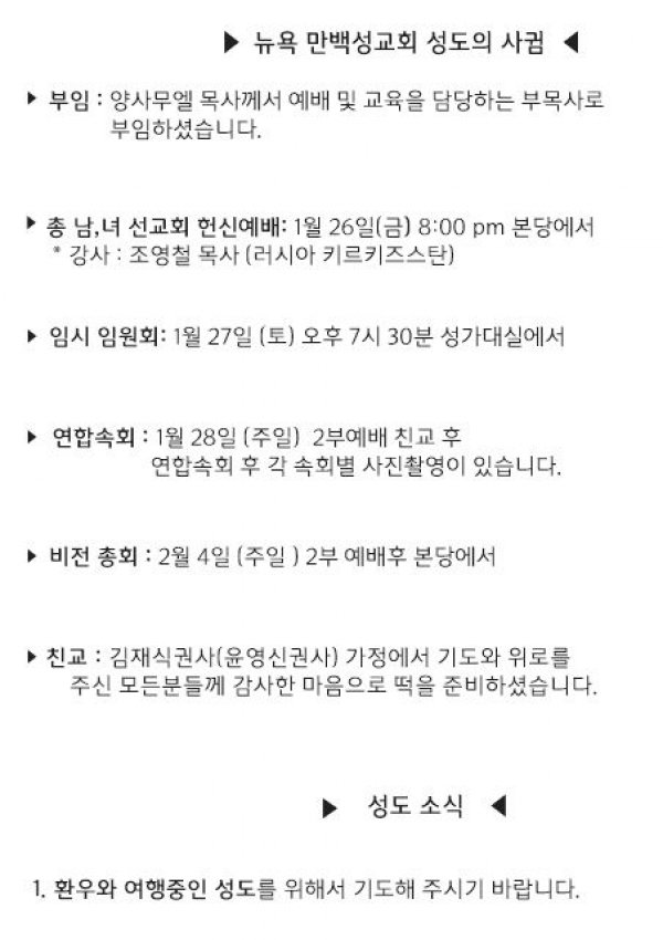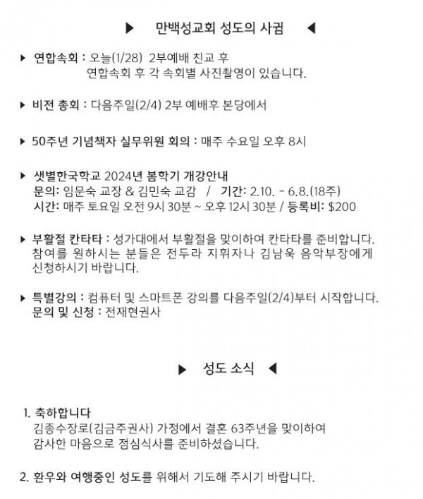 [교회소식] 2024년 1월 28일 뉴욕 만백성교회 성도의 사귐