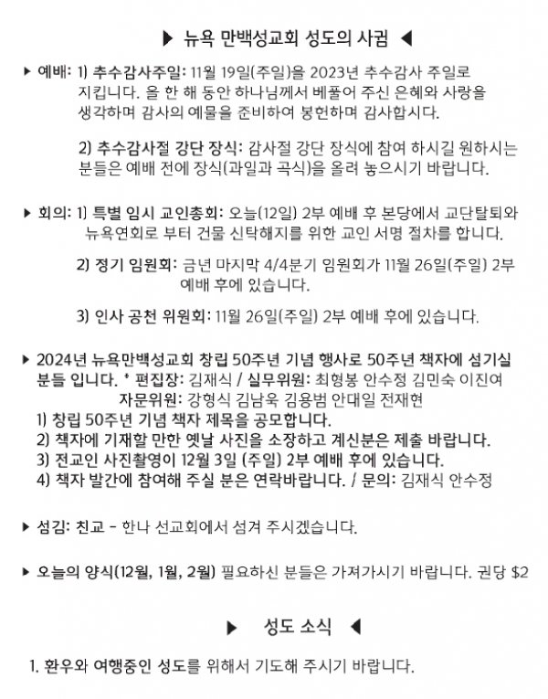 [교회소식] 2023년 11월 12일 뉴욕 만백성교회 성도의 사귐