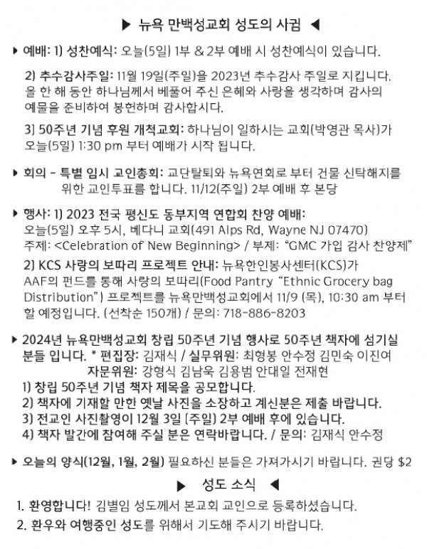 [교회소식] 2023년 11월 5일 뉴욕 만백성교회 성도의 사귐