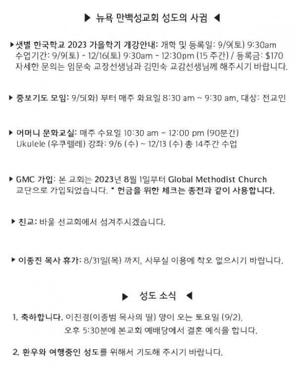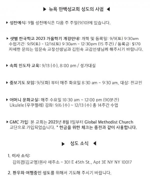 [교회소식] 2023년 9월 3일 뉴욕 만백성교회 성도의 사귐