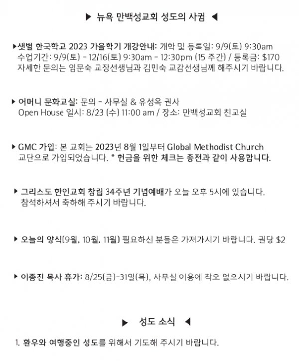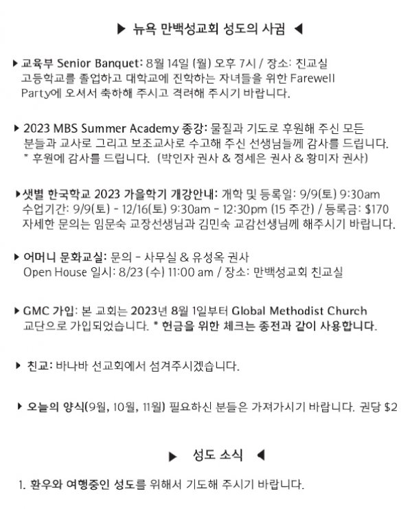 [교회소식] 2023년 8월 13일 뉴욕 만백성교회 성도의 사귐