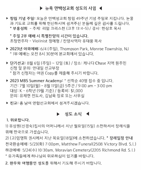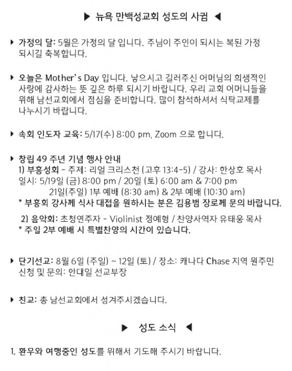 [교회소식] 2023년 5월 14일 뉴욕 만백성교회 성도의 사귐