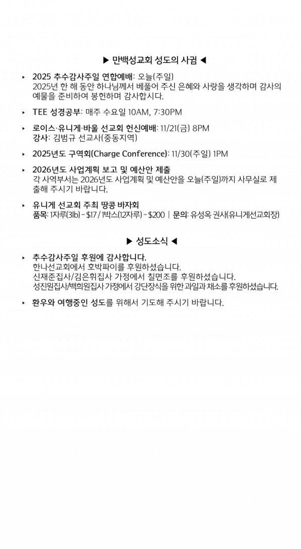 [교회소식] 2025년 11월 16일 뉴욕 만백성교회 성도의 사귐