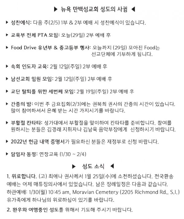 [교회소식] 2023년 1월 29일 뉴욕 만백성교회 성도의 사귐