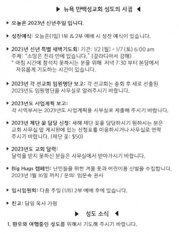 [교회소식] 2023년 1월 1일 뉴욕 만백성교회 성도의 사귐