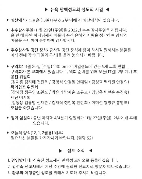 [교회소식] 2022년 11월 13일 뉴욕 만백성교회 성도의 사귐