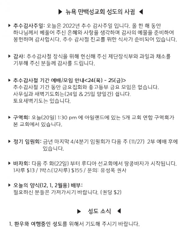[교회소식] 2022년 11월 27일 뉴욕 만백성교회 성도의 사귐