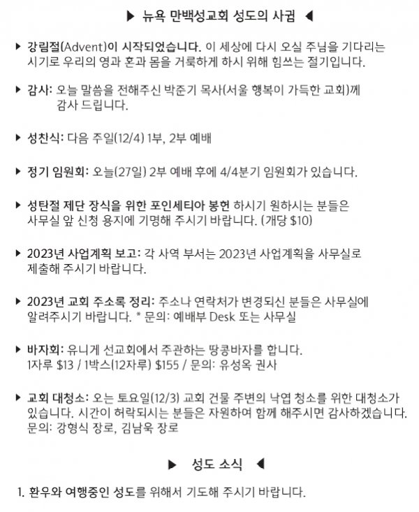 [교회소식] 2022년 12월 11일 뉴욕 만백성교회 성도의 사귐