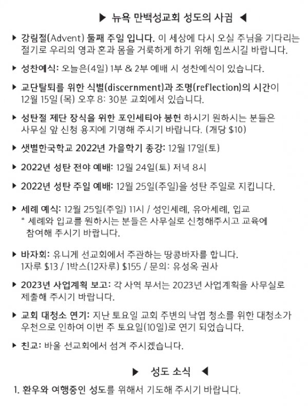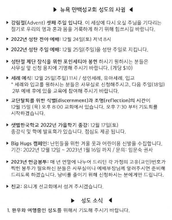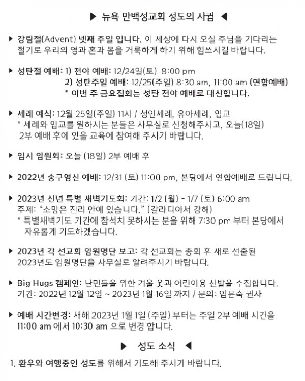 [교회소식] 2022년 12월 18일 뉴욕 만백성교회 성도의 사귐