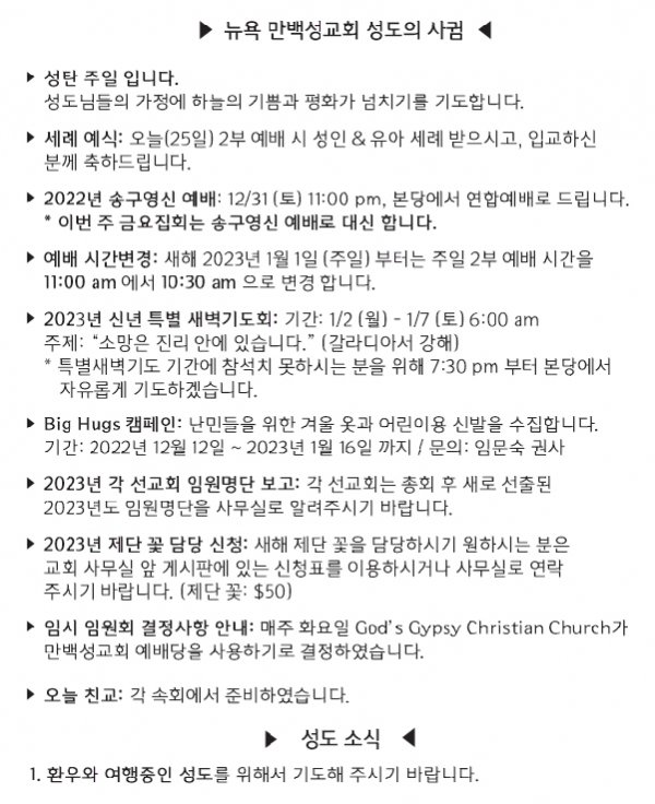 [교회소식] 2022년 12월 25일 뉴욕 만백성교회 성도의 사귐