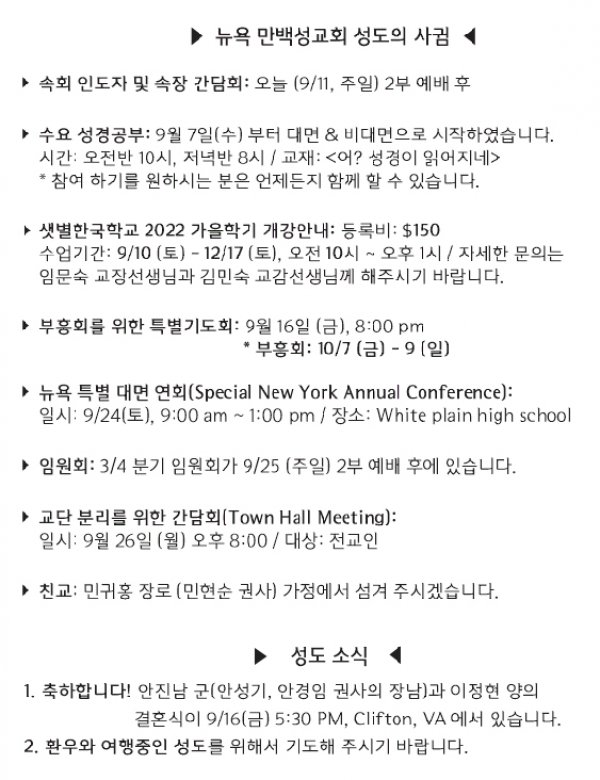 [교회소식] 2022년 9월 11일 뉴욕 만백성교회 성도의 사귐