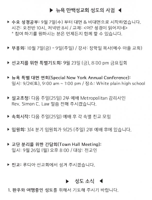 [교회소식] 2022년 9월 25일 뉴욕 만백성교회 성도의 사귐