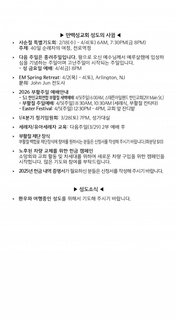 [교회소식] 2026년 3월 22일 뉴욕 만백성교회 성도의 사귐